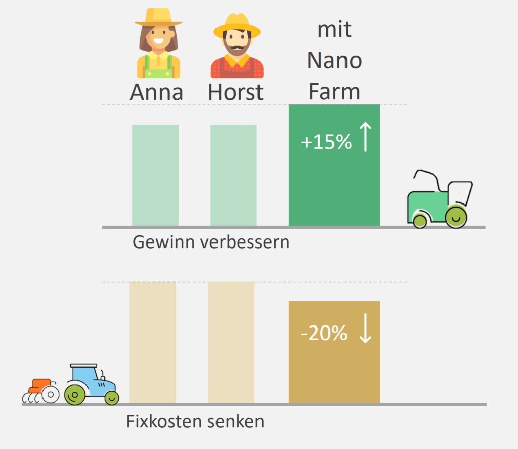 Nano-Farm bietet einen geschützten Rahmen, wo Du Deine Fixkosten um bis zu 20% senken, Dein landwirtschaftliches Einkommen um bis zu 15% verbessert werden kann und sich Dein Komfort bei der Arbeit am Feld verbessert.