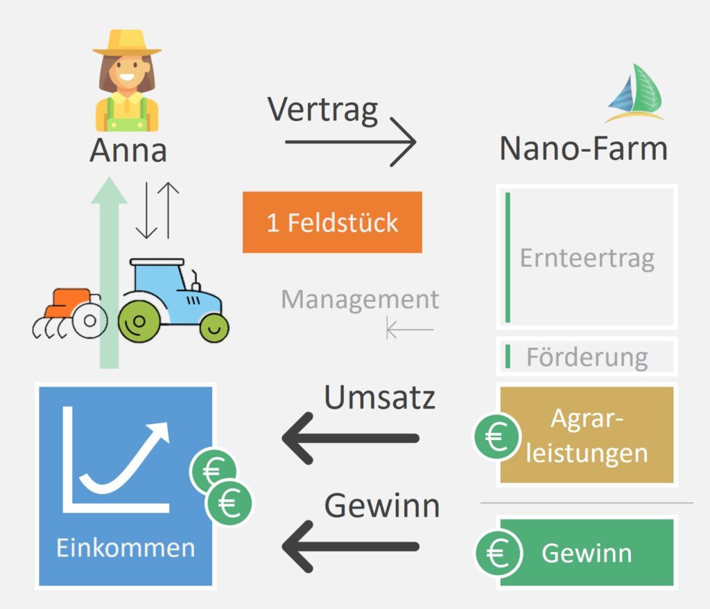 Die Basis bildet ein Pachtvertrag, die landwirtschaftliche UnternehmerIn (lwU) wird zur VerpächterIn, bewirtschaftet das Feldstück aber wie gehabt weiter. Nano-Farm erstattet der lwU alle Arbeitsschritte mit optimalen Verrechnungs-sätzen. Die dadurch sinkenden Fixkosten verbessern den Gewinn, der zu 100% als gewinnbasierte Pacht vergütet wird.